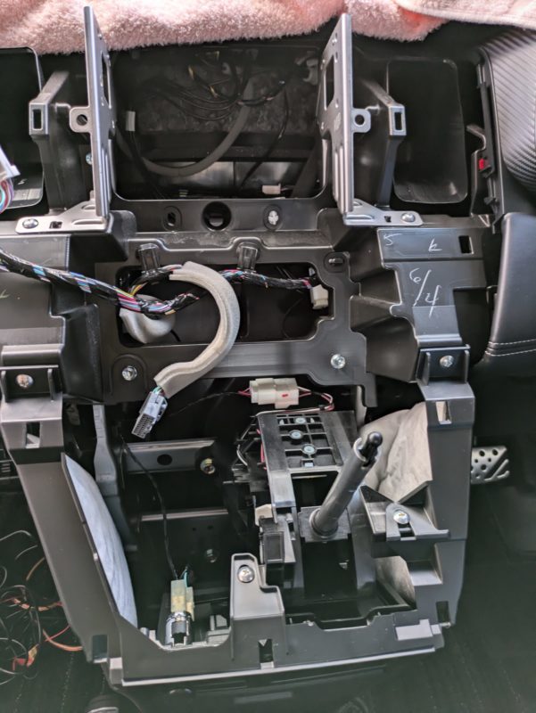 シフトノブの左の小さい枠を外して、ドライバーなどで押すと「P」からシフト変更できますので、カバーが取りやすくなります。