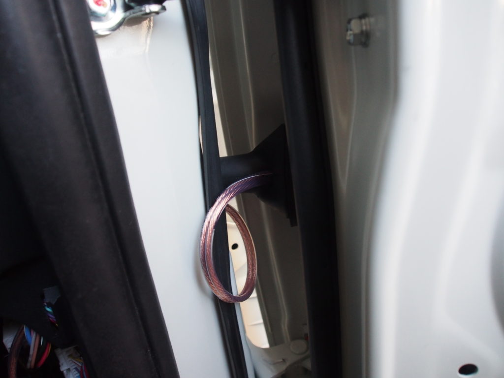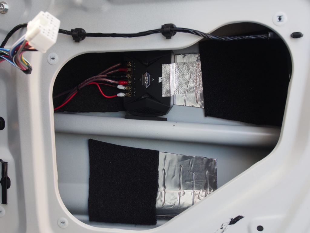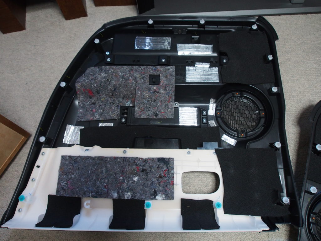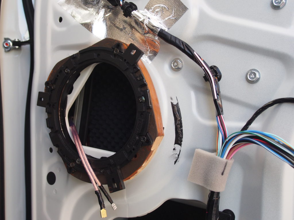 左上の金属棒は、エーモンから販売されている「補強プレート」大きいホールの場合、制振シートを貼っても弛んでしまうので音に影響があります。