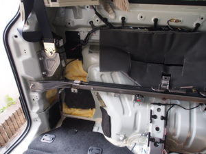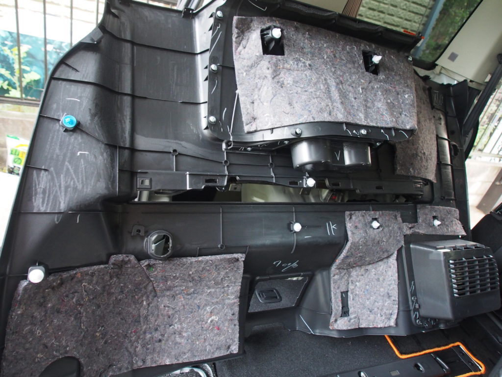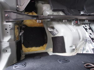 右の純正の黒い遮音材の奥は空洞でしたので、ここにも吸音材を敷き詰めます。