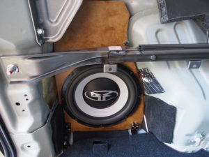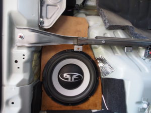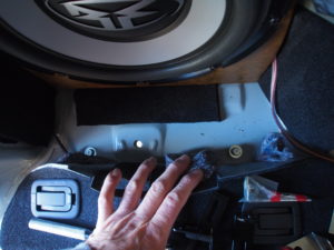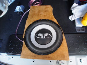 ヤフ〇クで購入した(やすかったー)ロックフォード・サブウーハーを設置します。サブウーハーだけなので(純正の取付ステーがない)、MDFボードでステーを作成します。