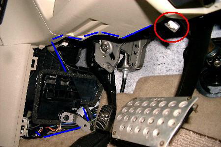 青色部分が今回新たに配線を這わせた部分赤い丸印がETC専用電源コネクタ |