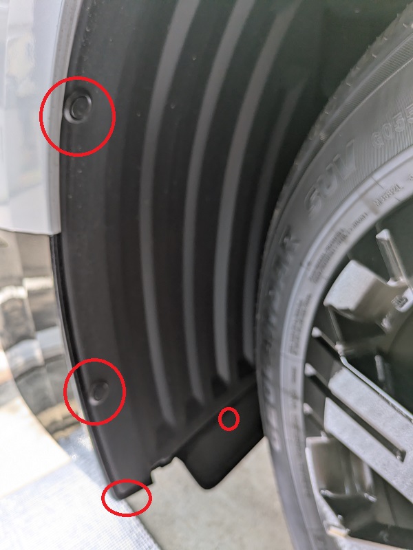 タイヤを右にめいっぱい切ったあと、赤丸のグロメットを4個(内側縦2か所、底部2か所)と赤丸の左一番下は10mmボルトです。
