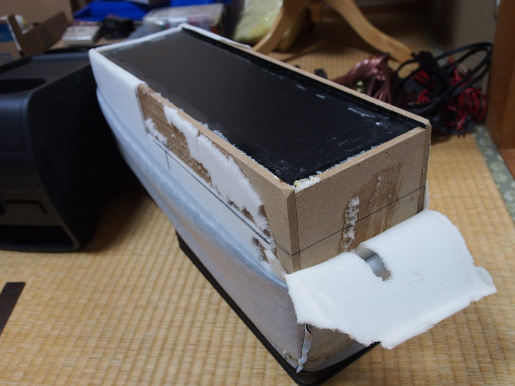 ベースはMDFボードで作成し、念のためにニスで防滴加工したあとに、薄い革製品のスエードを張り巡らします。