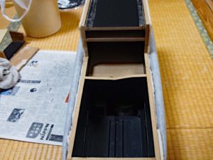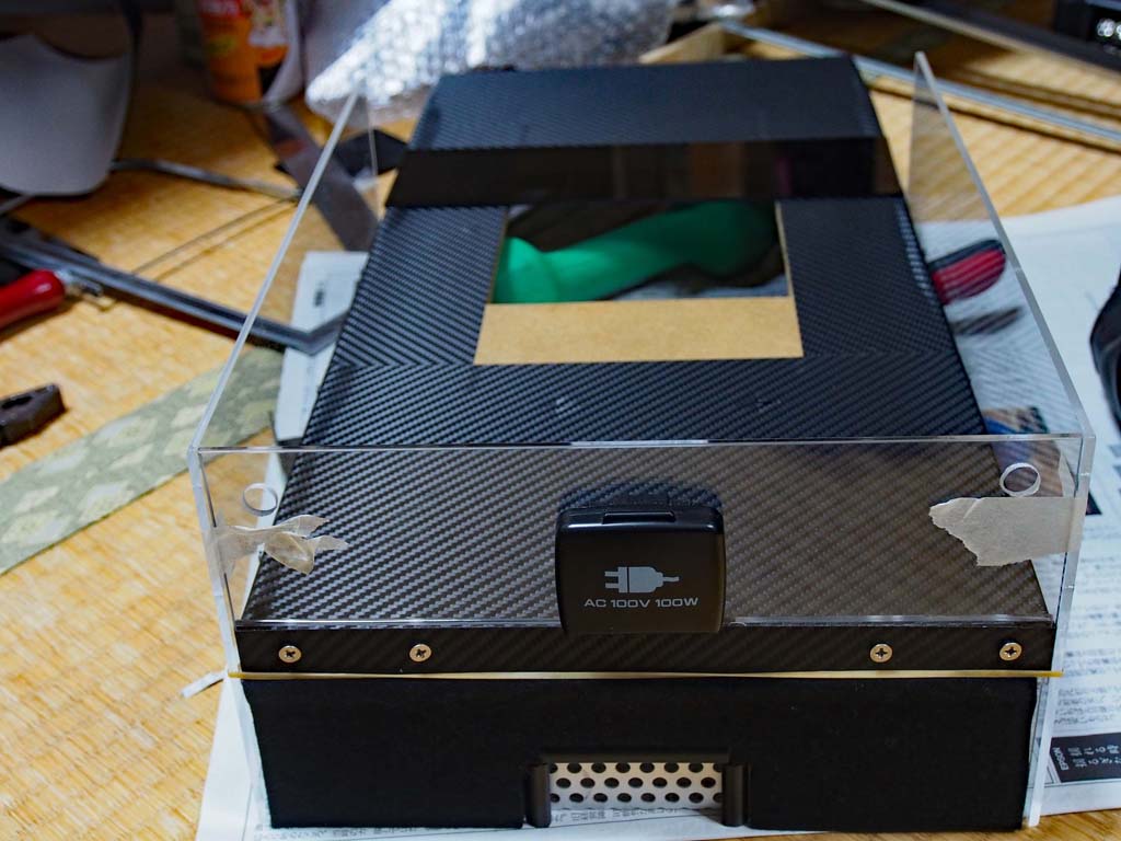 MDFボードに透明プラスチックを付けていきますが、これが結構難しかった。