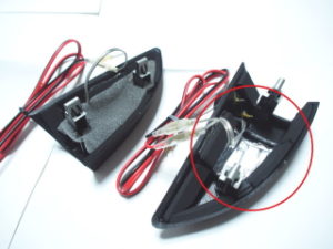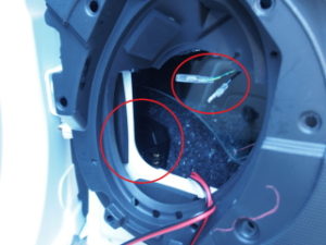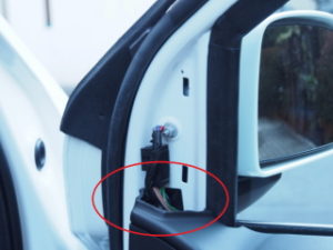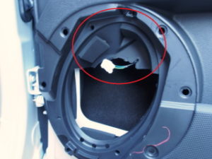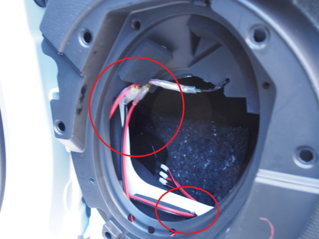 これがまた少しわざがいります。とくかく内張りが外せないので、小さな穴からなんとか配線するのですが、やり方としては、赤丸部分から細い針金を差し込んで、下のスピーカー口から手をいれて、針金を引き寄せます。
