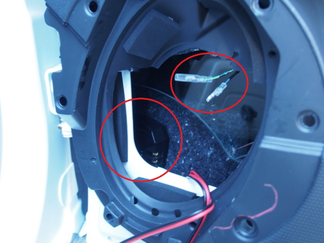 リア同様、スピーカーのコネクタは合わないので加工します。(右の赤丸)