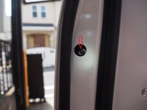 まず、ドア横の黒いゴムを外し、写真の赤い部分のネジを緩めます。