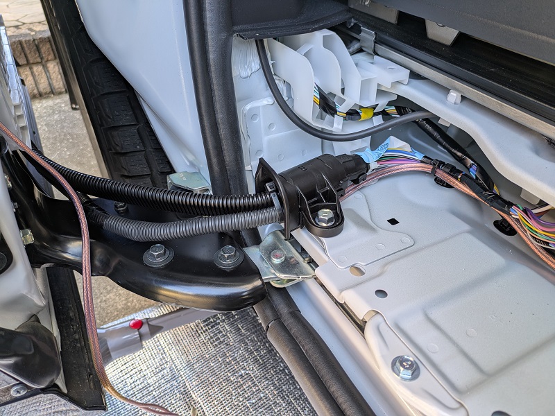 各配線はこの白いプラスチック内に配線されてて、スライドドアが動いてもプラスチック内で巻き取れるようになってます。