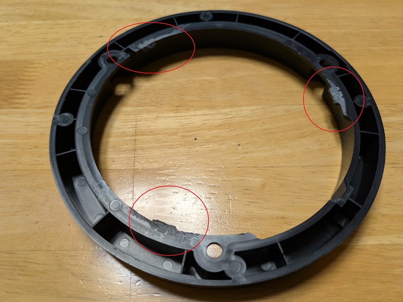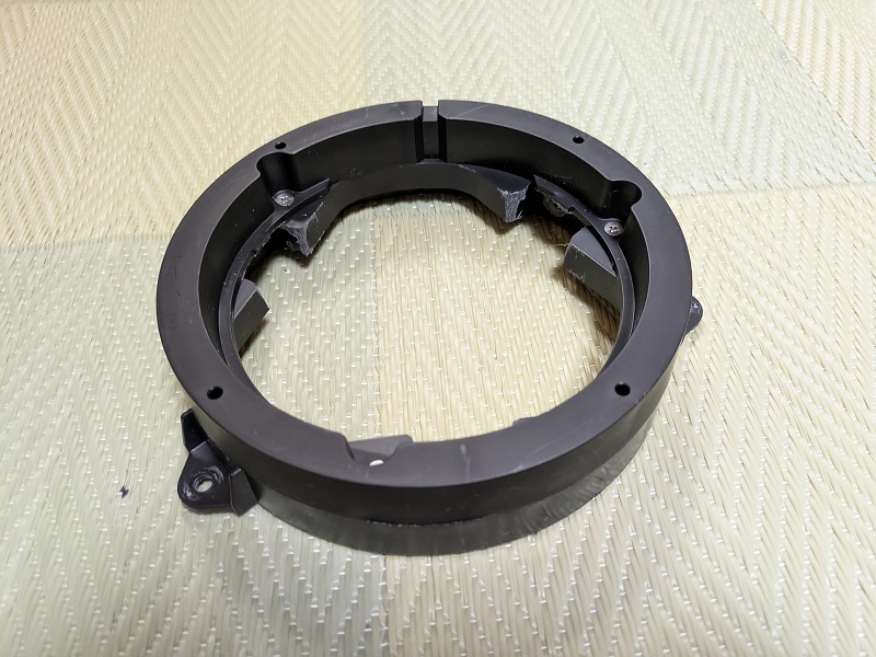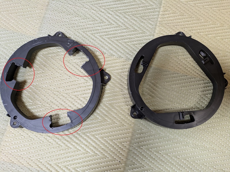 これでJBLのマグネット部分があたり入らないので、この突起物ごとカットします。(左:赤丸)