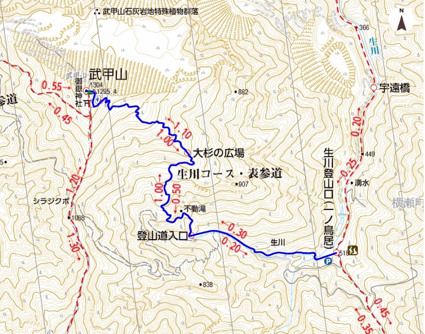 | コース | 一の鳥居駐車場(9:50)⇒15丁目登山口(10:11) ⇒ 大杉の広場(11:04) ⇒武甲山(12:00)⇒登山口(14:43)⇒駐車場(15:00) |
